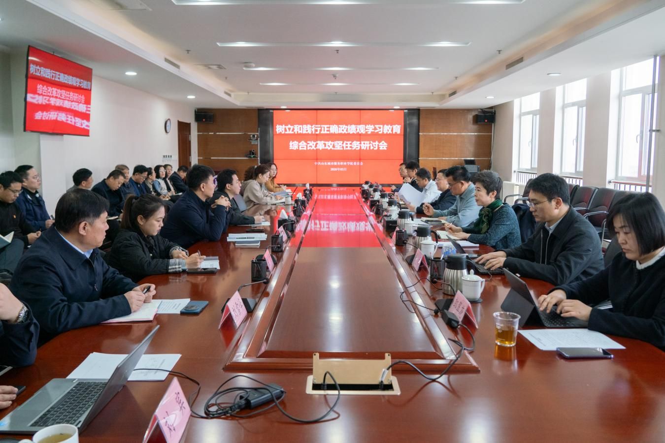 3月12日,山东城市服务职业学院召开树立和践行正确政绩观学习教育暨综合改革攻坚任务研讨会,锚定学校深化改革、提质升级发展目标,系统谋划破题路径、部署推进举措。党委副书记、院长王家敏主持会议,党委班子成员和全体中层干部参加会议。会议集中学习了山东省委“干事创业担当尽责确保‘十五五’开好局”工作会议以及鲁商集团深化改革高质量发展专题研讨会精神。会议指出,要扎实开展树立和践行正确政绩观学习教育,弘扬求真务实良好作风,...