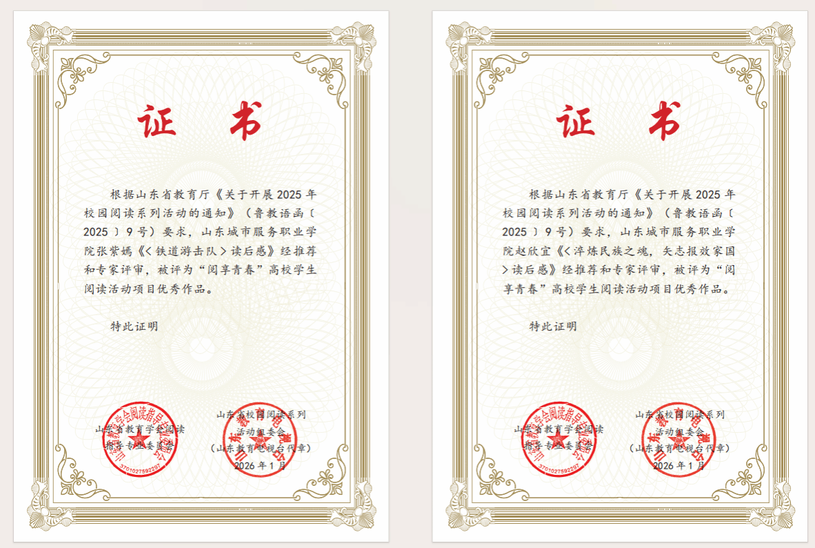 近日,山东省校园阅读系列活动评选结果正式揭晓。本次活动中,我校学生积极参与、认真创作,经学校和省级专家推荐评审,2名学子作品获“阅享青春”高校学生阅读活动项目优秀作品,9名学子作品入选山东省校园阅读系列活动“‘阅享青春’高校学生阅读活动”读书心得展演范畴。这份成绩,既是参赛选手个人能力的彰显,也是我校书香校园建设与阅读教育实践长期深耕结出的硕果。一直以来,我校高度重视校园阅读工作,积极开展读书分享、经典诵读、...