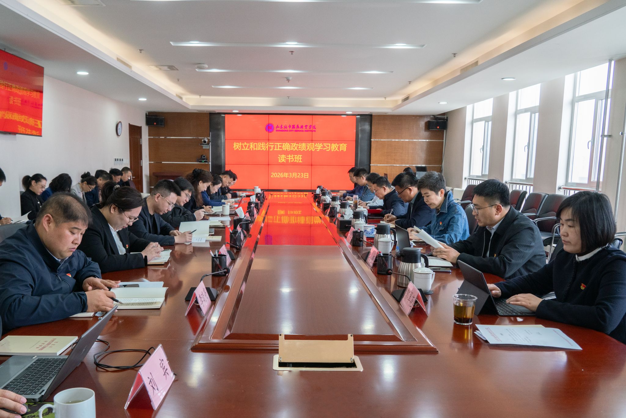 3月23日至3月24日,山东城市服务职业学院举办树立和践行正确政绩观学习教育读书班开班式暨2026年第3次党委理论学习中心组(扩大)学习会,深入学习习近平总书记在全国两会期间的重要讲话精神和全国两会精神,认真学习领会习近平总书记关于树立和践行正确政绩观的重要论述,以笃行实干推动“十五五”开好局、起好步。开班式上,学校党委副书记、院长王家敏作动员讲话。他指出,举办本次读书班,既是深入学习贯彻全国两会精神的具体行动,...