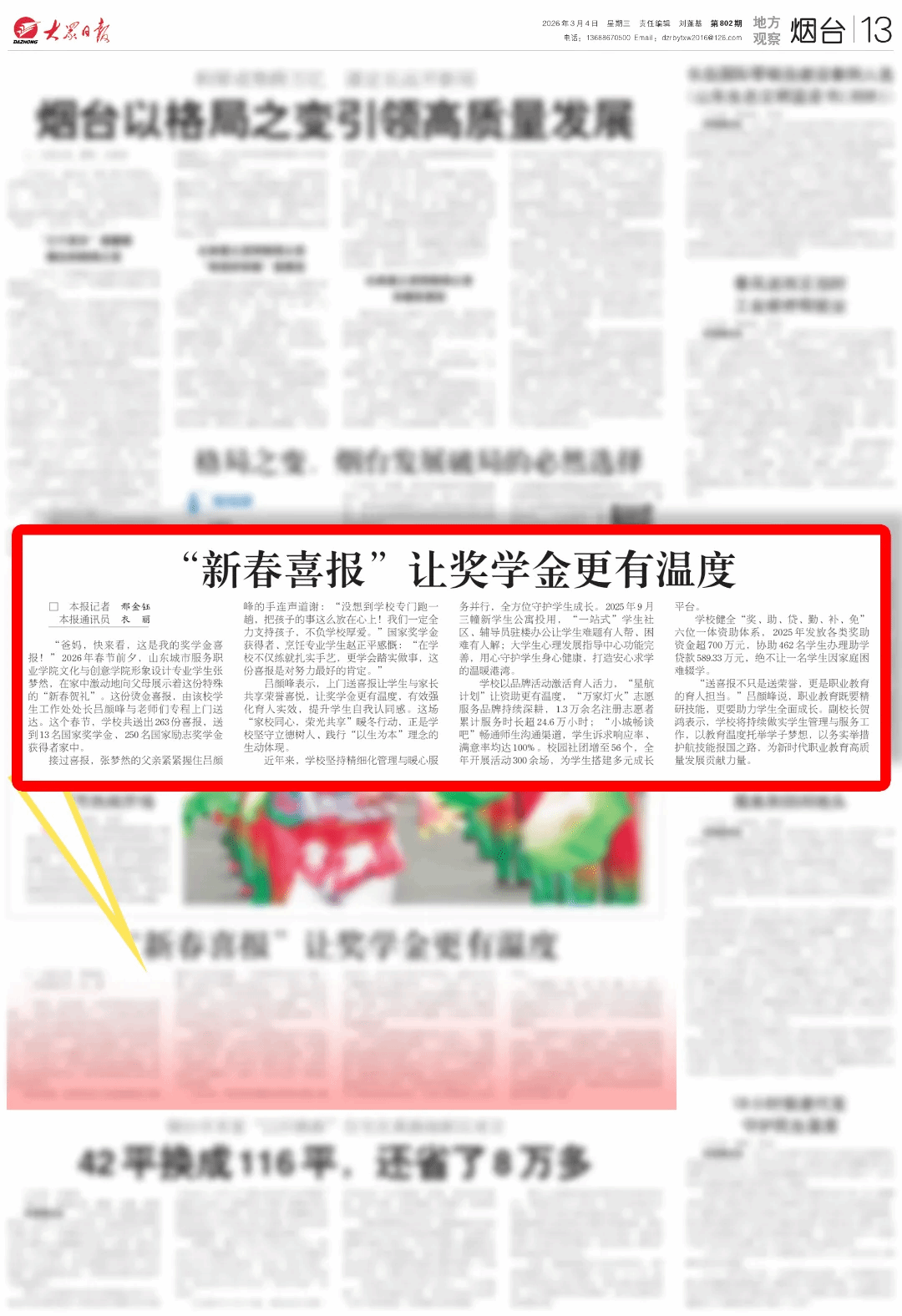 马年新春到来之时,一份特殊的“贺礼”正飞入山东城市服务职业学院学子的家中。近日,学校老师们化身“送喜使者”,将263份奖学金喜报亲手送到国家奖学金和国家励志奖学金获得者家中,与家长共享荣光。这一暖心举措不仅让学生感受到努力被看见的喜悦,更彰显了学校“以生为本”的育人温度。3月4日,《大众日报》以《“新春喜报”让奖学金更有温度》为题对学校的做法进行了专题报道。“爸妈,快来看,这是我的奖学金喜报!”2026年春节前夕,...