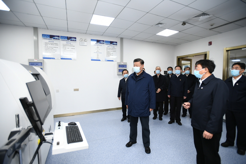 10月22日下午,中共中央总书记、国家主席、中央军委主席习近平在山东省济南市主持召开深入推动黄河流域生态保护和高质量发展座谈会并发表重要讲话。这是座谈会前,习近平21日下午在东营市胜利油田勘探开发研究院页岩油实验室考察自主创新情况。新华社记者 谢环驰 摄