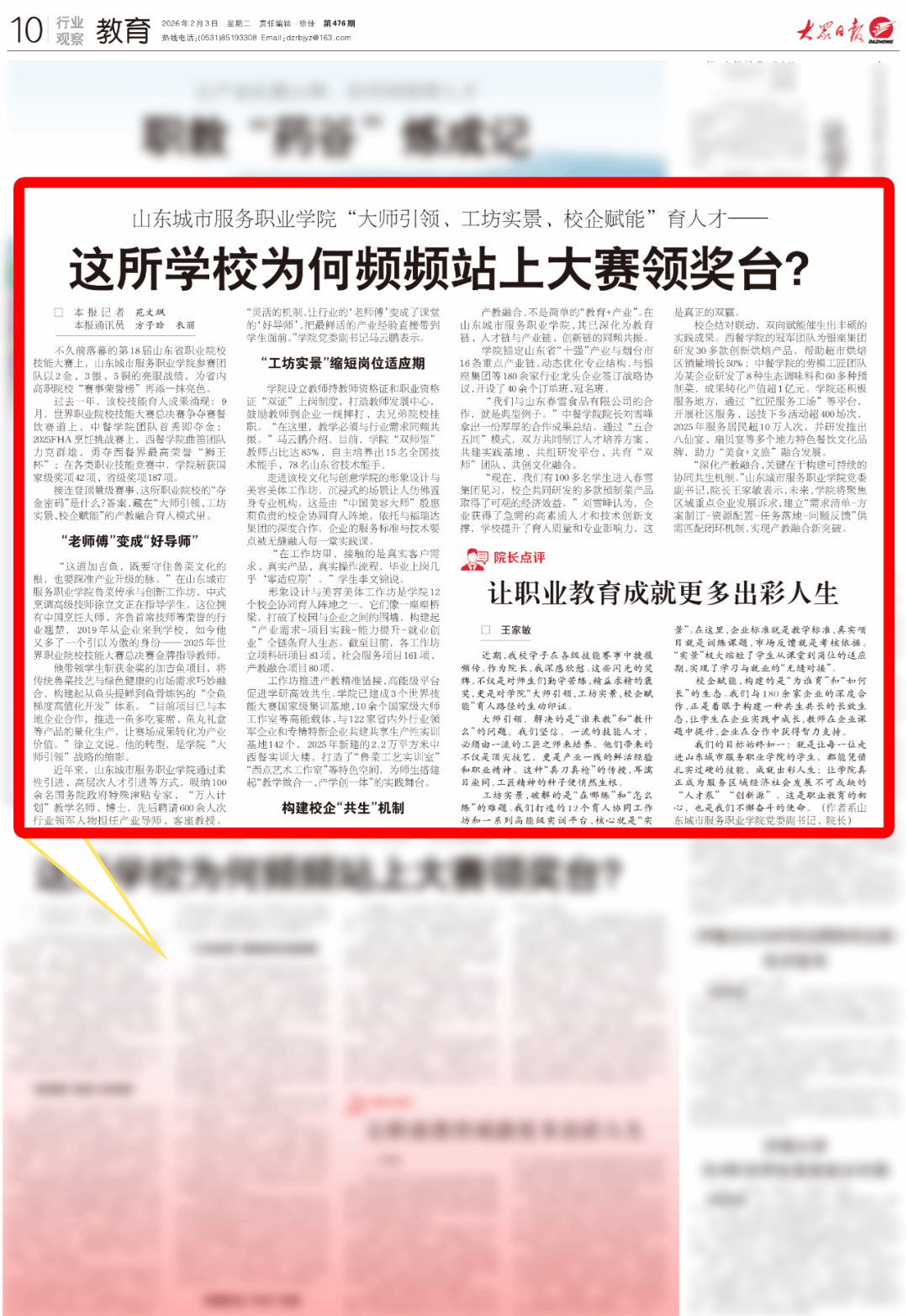 山东城市服务职业学院通过“大师引领、工坊实景、校企赋能”的产教融合育人模式,在高职技能竞赛中屡获佳绩。学校引入行业大师教学,建设实景化工坊,并与企业深度合作,推动教学与产业需求紧密结合。该模式不仅提升了学生的实战技能与就业竞争力,还实现了科研成果的有效转化,服务地方经济社会发展。《大众日报》对学校的成功经验作了深入报道。