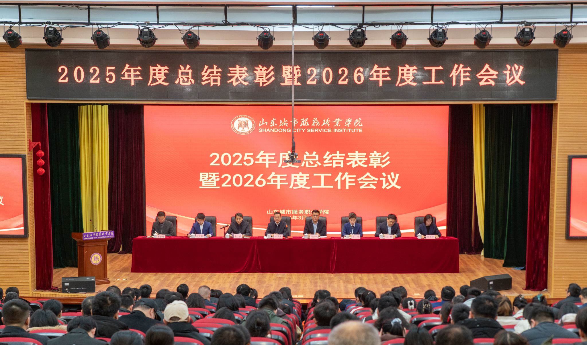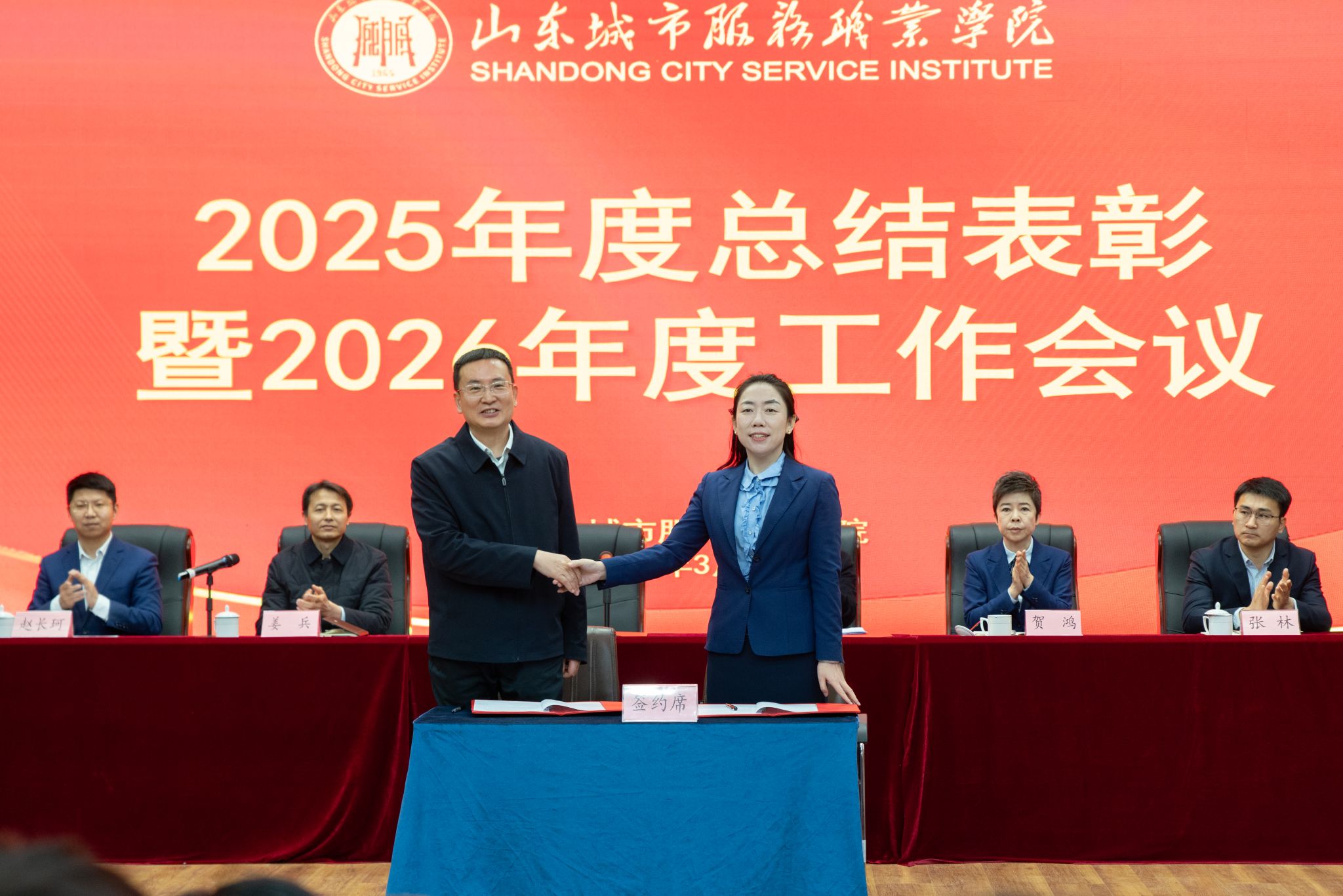 3月5日,山东城市服务职业学院召开2025年度总结表彰暨2026年度工作会议。学校党委副书记、院长王家敏作了题为《深化改革攻坚 全面提质跃升 为加快建成国内知名、省内领先、特色鲜明的高水平职业院校而团结奋斗》的报告,并与部门代表签订2026年度目标考核责任书,党委副书记马云鹏宣读表彰决定,党委委员、副院长姜兵主持会议,班子领导、全体中层干部及教职工出席会议。