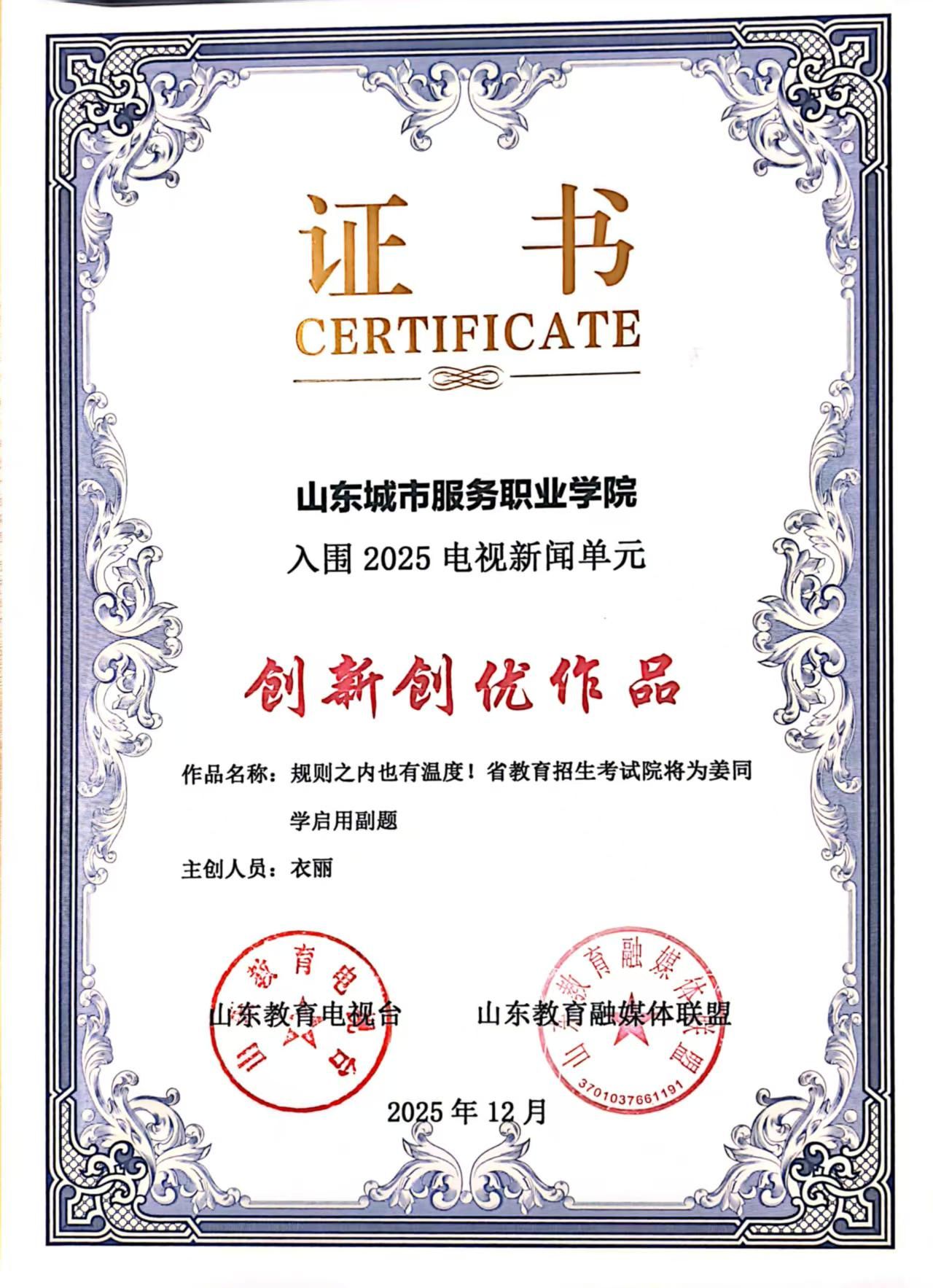 凭借出色的宣传成效,学校先后获评“2025年度融媒传播影响力高校”“山东教育融媒体联盟2025通联协作类创新创优项目”“2025山东教育发布App教育号运营类创新创优项目”等多项荣誉称号,获山东电视台、山东教育电视台感谢表扬,宣传工作综合影响力稳居全省高职院校前列。