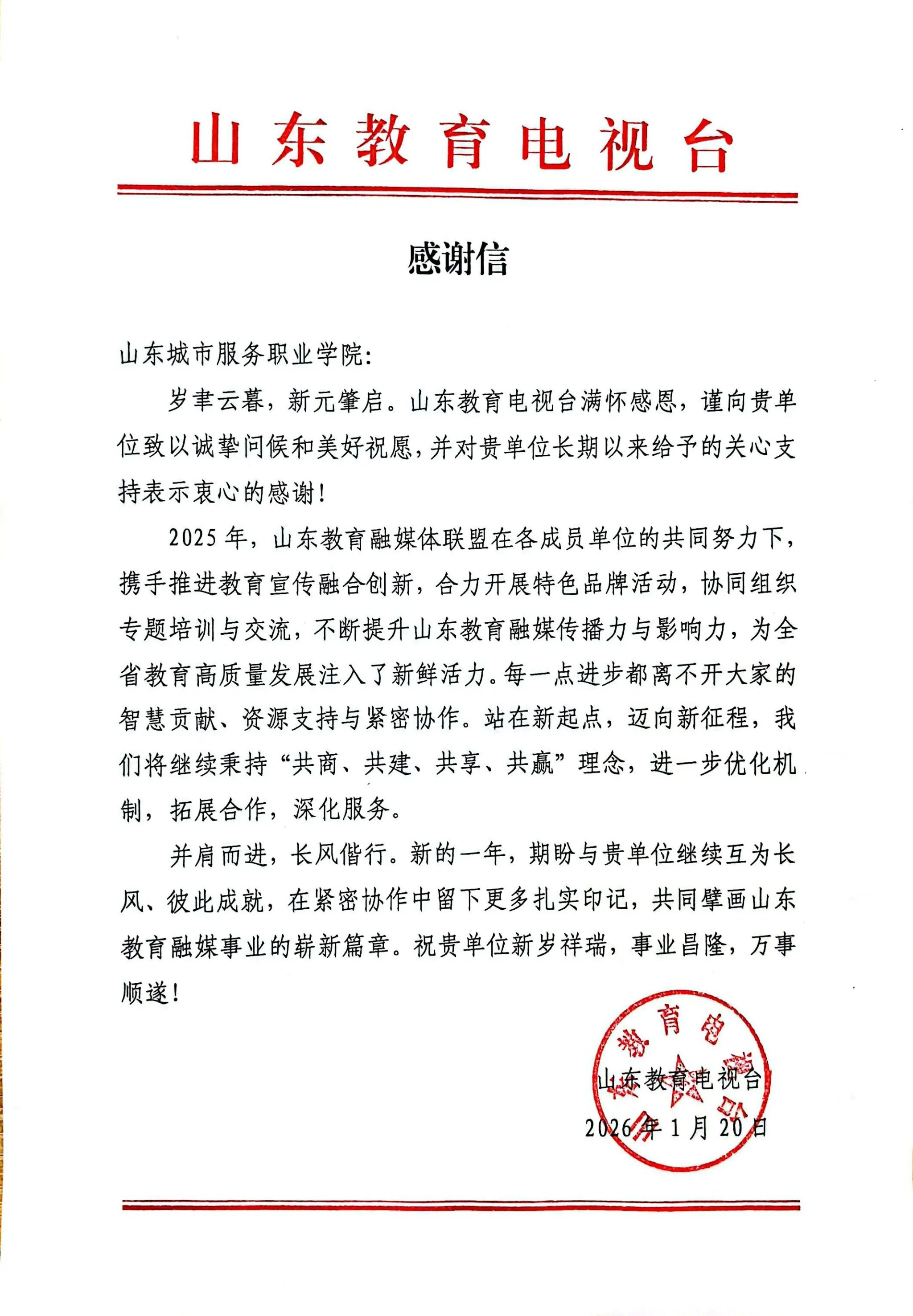 近日,山东城市服务职业学院收到山东省教育厅的表扬信,对学院2025年宣传工作予以肯定。信中明确表示,过去一年,学院主动担当、锐意创新,围绕教育强省建设中心任务,策划系列主题宣传,在宣传实践中全面展示了新时代山东教育的良好形象,进一步拓展了教育故事的传播广度和深度,凝聚起广泛社会认同。