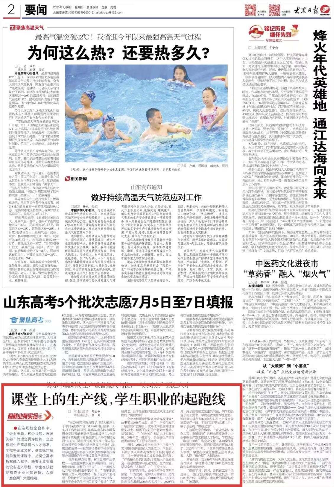 《大众日报》第2版报道《课堂上的生产线,学生职业的起跑线》