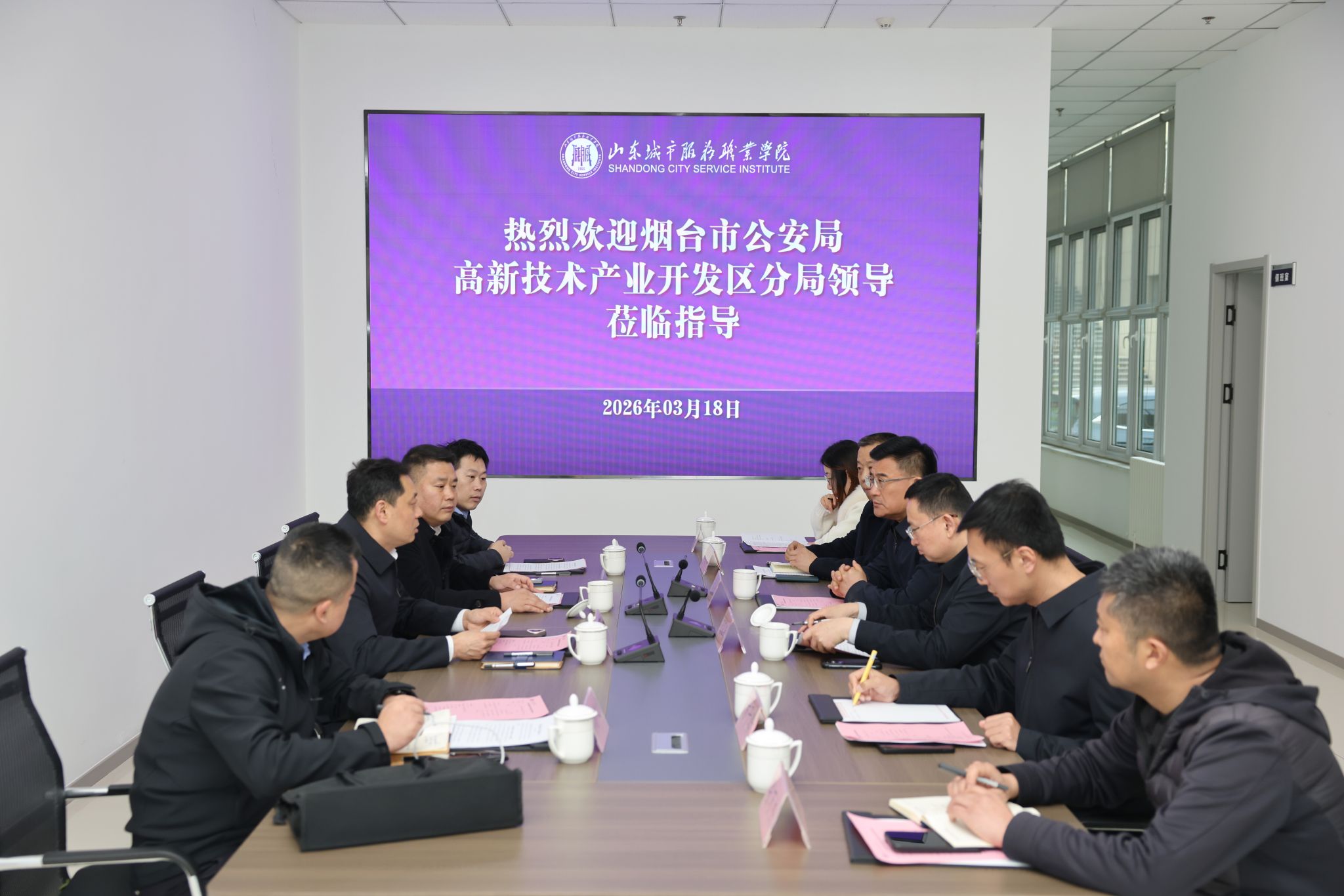 3月19日,烟台市公安局高新技术产业区分局党委书记、局长刘强,党委委员、治安大队长王善忠等一行四人到访山东城市服务职业学院。学校党委副书记、院长王家敏,党委副书记马云鹏,党委委员、宣传统战部部长方子晗及相关部门同志热情接待了来宾,并围绕校园安全工作开展座谈交流。