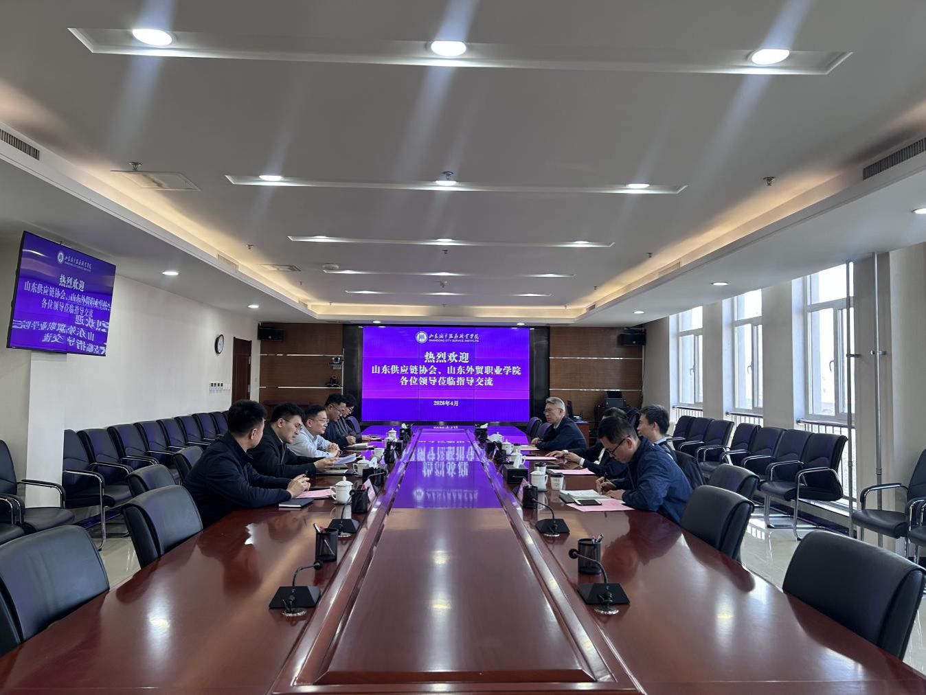 4月1日,山东省供应链管理协会会长宋兵、山东外贸职业学院纪委书记张磊一行来我校开展交流。学校党委副书记、院长王家敏,纪委书记张林及部门负责人参加座谈。