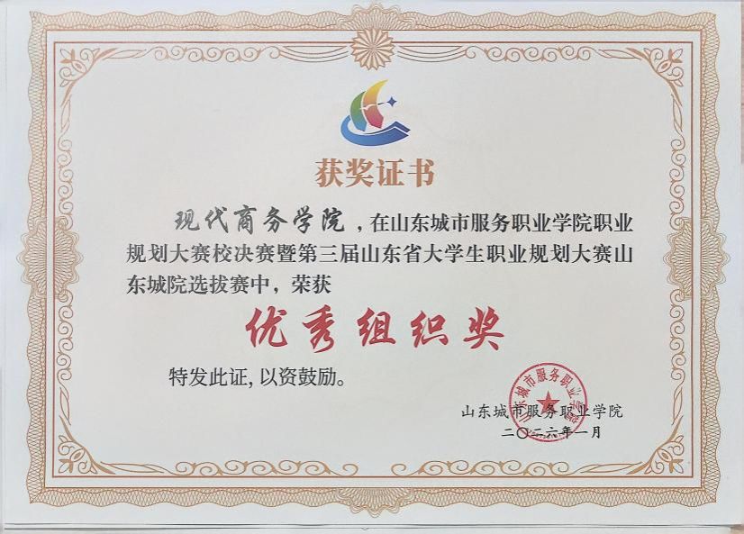 荣获“优秀组织奖”是鼓励,更是鞭策。现代商务学院深知,职业规划不是一场比赛的“昙花一现”,而是贯穿大学生涯的“持久工程”。下一步,现代商务学院将继续以此为契机,深化“以赛促学、以赛促教”的长效机制,进一步优化职业生涯规划指导服务体系,将赛事经验转化为育人实效。学院将持续推进校企协同育人,搭建更多实践平台,引导广大学子在新时代的广阔舞台上,以科学的规划为桨,以过硬的本领为帆,在青春的赛道上奋力奔跑,跑出当代青年的最好成绩!筑梦青春,我们一直在路上;职引未来,现代商务学院与你并肩同行!